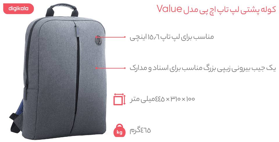 کولهپشتی «اچپی» مدل «Value» برای لپتاپهای 15.6اینچی مناسب است و در آن محفظهای اصلی برای نگهداری لپتاپ و لوازم جانبی مربوط به آن مانند ماوس، شارژر و دیگر لوازم تعبیه شده است. کولهپشتی Value یک محل مخصوص هم برای قراردادن تبلت و تعدادی جیب کوچک برای گوشی موبایل و لوازمتحریر دارد. محفظهی اصلی این کولهپشتی از طریق زیپ باز و بسته میشود. علاوهبراین میتوانید کتاب و اسناد و مدارک خود را در این قسمت قرار دهید؛ اما برای وسایلی که میخواهید بیشتر در دسترستان باشند، جای مخصوصی تعبیه شده که یک جیب زیپی در جلوی کیف است. وزن این کوله 465 گرم و طول و عرض آن به ترتیب 44.5 و 31 سانتیمتر است و 10 سانتیمتر ضخامت دارد. کولهی لپتاپ Value اچپی (HP) مانند بیشتر کولهپشتیها دارای دو بند است که میتوان آن را برای جثههای متفاوت تنظیم کرد. میتوانید هر زمان که تمایل به حمل دستی داشتید، از دستهی مخصوص این کار استفاده کنید. رنگ خاکستری و طراحی سادهی این کولهپشتی آن را برای بسیاری از مکانها مناسب کرده است.