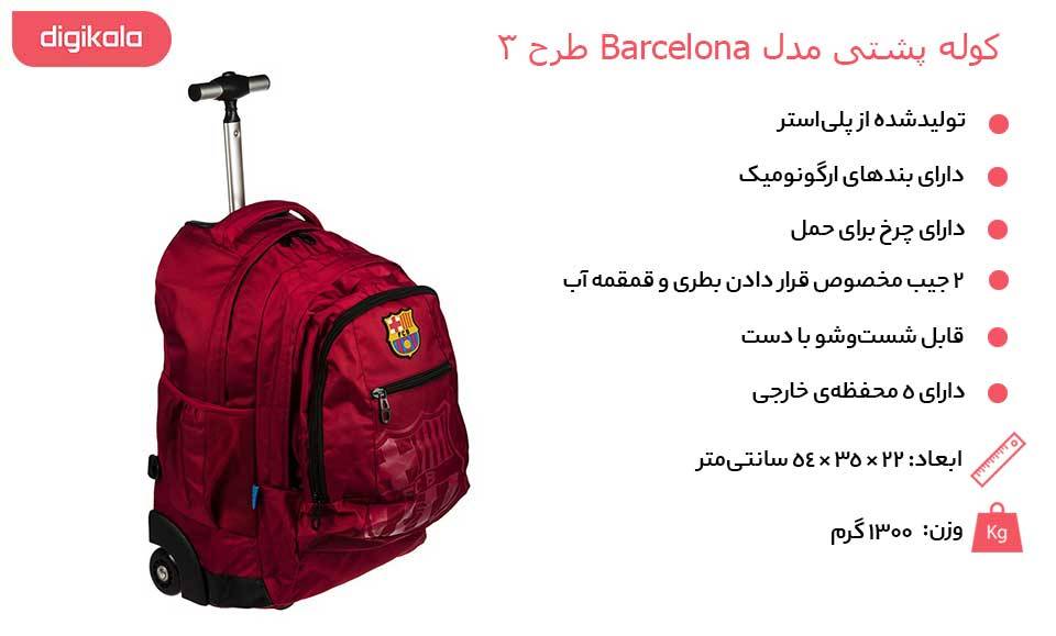 اگر در فکر خرید یک کوله‌پشتی تمام‌عیار هستید، بهتر است کوله‌پشتی «بارسلونا» (Barcelona) طرح 3 را در نظر داشته باشید. یک کوله‌پشتی جادار، بادوام و ارگونومیک با چرخ‌هایی که می‌توانید برای حمل از آن‌ها بهره بگیرید. گذشته از آن اگر از طرفداران تیم محبوب بارسلونا هستید، اصلاً در خرید این کوله‌پشتی تردید نکنید. پنج محفظه‌‌ بیرون کیف وجود دارد و داخل کیف جیب‌های کوچکی قرار دارد که وسایلی  مثل خودکار و کاغذهای کوچک را درخود جای می‌دهد. بارسلونا از پلی‌استر تولید شده و برای شستن آن مانعی وجود ندارد. این کیف در دو رنگ قرمز و مشکی تهیه‌ شده است و می‌تواند نظر بیشتر افراد را جلب کند. با وجود پد داخل بندها و پشتی هیچ فشاری به شانه‌ها و کمر وارد نخواهد شد؛ اما اگر حجم وسایل زیاد و تحمل وزن کیف برایتان دشوار بود، نگران نباشید. دو چرخ زیر کوله در نظر گرفته شده که با استفاده از دسته‌ی فلزی می‌توانید آن را بکشید و جابه‌جا کنید. دسته به‌صورت تلسکوپی باز و بسته می‌شود و بین 35 و 55 سانتی‌متر متغیر است. هر چرخ هم 8 سانتی‌متر قطر دارد. دو پایه‌ی کوچک پلاستیکی جلوی کیف قرار دارد که از تماس کیف با زمین و کثیف‌شدن آن جلوگیری می‌کند. اگر دوست داشتید بطری آب همراه خود داشته باشید، از جیب بدون بست کنار کیف استفاده کنید. یک جیب در پشت این مدل در نظر گرفته شده که بندهای کوله‌پشتی را در خود پنهان می‌کند. کوله‌پشتی بارسلونا طرح 3 محصولی مناسب و ایدئال برای اغلب افراد است.