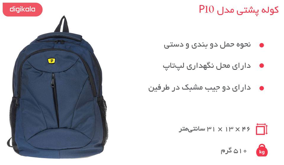 استفاده از یک کیف یا کوله‌ی مناسب و جادار برای حمل لوازم شخصی در طول روز از اهمیت بالایی برخوردار است. کوله‌پشتی مدل «P10» به‌علت داشتن ابعاد مناسب و در اختیار قراردادن فضای کافی برای همراه داشتن لوازم شخصی، محصولی مناسب برای استفاده‌ی روزمره محسوب می‌شود. در ساخت این محصول، پارچه‌ای ساده و بدون طرح به‌ کار‌ رفته است تا هم خانم‌ها و هم آقایان بتوانند از آن برای نگهداری لوازم شخصی‌شان بهره ببرند. به‌منظور حمل آسان کوله، دو بند قابل‌تنظیم و نسبتا بلند در قسمت پشت آن دوخته شده است. با تغییر طول این بند‌ها به دلخواهتان، استفاده از کوله برایتان راحت‌تر خواهد شد. ناگفته نماند که یک بند کوچک نیز در قسمت بالای کوله وجود دارد که برای حمل دستی مناسب است. داخل محفظه‌ی اصلی این کوله، یک جیب برای نگهداری لپ‌تاپ وجود دارد؛ به‌این‌ترتیب بدون نیاز به خریداری یک کیف جداگانه می‌توانید در هر جایی لپ‌تاپ شخصی‌تان را همراه داشته باشید. علاوه‌ بر این جیب داخلی، دو جیب مشبک و دو جیب زیپ‌دار نیز در قسمت بیرونی وجود دارند. با کمک این جیب‌ها قادر هستید تمام لوازم روزمره‌تان را به بهترین شکل تفکیک‌ کنید و هنگام نیاز، به‌سرعت به آن‌ها دسترسی داشته باشید.