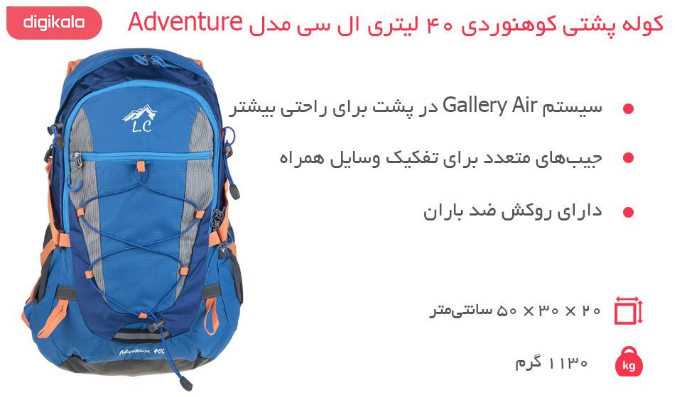 کوله‌پشتی کوهنوردی «ال سی» مدل «Adventure» با ظرفیت 40لیتری، برای استفاده در برنامه‌های طبیعت‌گردی و کوهنوردی کوتاه‌مدت مناسب است. قسمت پشتی این کوله به سیستم «Gallery Air» مجهز است که باعث راحتی در زمان حمل آن می‌شود. این سیستم که به شکل یک صفحه‌ی مشبک در قسمت پشتی کوله کار شده است، باعث می‌شود در زمان حمل آن، فشار وارده به پشت تاحدی کاهش یابد. مهم‌ترین ویژگی این صفحه‌ی مشبک، دادن اجازه‌ی هواخوری به پشت است که به کاهش تعریق در زمان کوله‌کشی منجر می‌شود. این کوله از پارچه‌ای مستحکم و مقاوم تولید شده است و می‌تواند برای استفاده در محیط‌های کوهستانی، گزینه‌ِ‌ی خوبی باشد. برای این محصول، جیب‌های متعدد بیرونی و درونی نیز ایجاد شده است که کمک می‌کند تا بتوان وسایل همراه را به شکل خوبی تفکیک کرد و در دسترس قرار داد. برای حمل این محصول، سه دسته در نظر گرفته‌‌اند که یکی به شکل یک بند در بالاست و برای حمل دستی کاربرد دارد و دو بند دیگر نیز برای حمل دوشی و تعبیه‌شده در پشت محصول هستند. بندهای دوشی این مدل قابلیت تنظیم اندازه هم دارند تا بتوان بسته به نیاز، اندازه‌ی آن‌ها را تغییر داد. همچنین این دو بند ساختاری مشبک دارند که کمک می‌کنند در زمان حمل کوله، بدن دیرتر گرم شود و تعریق کمتری هم اتفاق بیفتد.
