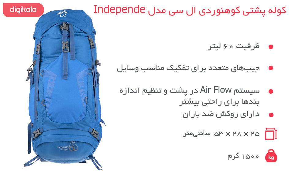 ویژگیهای کلی کوله پشتی کوهنوردی 60 لیتری ال سی مدل Independe