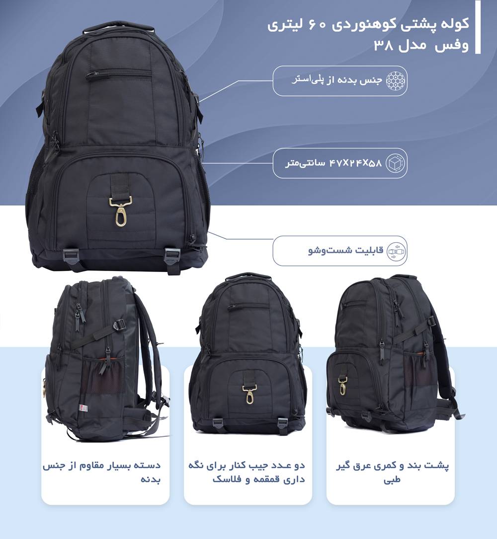 اگر پای ثابت کوهنوردی هستید و یا مدام به مسافرت میروید، نمیتوانید بدون داشتن یک کوله پشتی مطمئن، جادار و مقاوم از سفر خود لذت ببرید. کوله پشتی کوهنوردی 60 لیتری مدل 38 میتواند همسفر بسیار مناسبی برای شما باشد. جنس پارچه این محصول ضد آب بوده و کاملا قابل شستوشو است. آستر بسیار باکیفیت در سراسر کوله وجود دارد تا عمر استفاده از آن را چندید برابر کند. همچنین پشت بند طبی و عرق گیر این کوله مانع از خستگی شانهها در طول مسیر میشود و بند کمری بسیار مقاوم آن توازن بسیار خوبی را در وزن آن ایجاد میکند. دو جیب بزرگ در کنارهها فضای بیشتری را در اختیار شما قرار میدهد. دو عدد جیب در داخل کوله پشتی و یک عدد در پشت درب نقاب دار کوله نیز محفظه مناسبی برای قرار دادن گوشی، مدارک و وسایل مورد نیاز به شما میدهد. استوکهای انتهای کوله نیز در زمان قرار دادن بر روی زمین به خوبی تعادل آن را حفظ میکند. بندهای اضافی در جلو و پایین کوله که با سگک مهار شدهاند به شما اجازه میدهند تا به راحتی کیسه خواب، زیر انداز، پتو، چادر و .... را روی کوله بسته و حمل کنید.