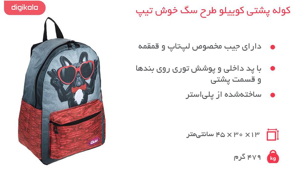 «کوله‌پشتی کوییلو طرح سگ خوش‌تیپ» کیفی با طراحی زیبا و منحصربه‌فرد است. واضح است که این زیبایی بدون دوام و کارایی مناسب، چندان به چشم نمی‌آید؛ به همین دلیل این کیف نه‌تنها از پلی‌استری بادوام ساخته شده است، بلکه با داشتن جای کافی برای قراردادن وسایل مختلف از کتاب و دفتر گرفته تا حتی قمقمه، به‌خوبی از عهده‌ی همراهی شما برمی‌آید.