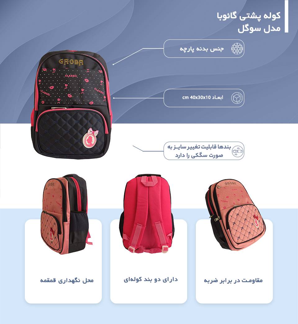 مشخصات فنی مشخصات کلیابعاد 40x30x10 سانتیمتر وزن 800 گرم جنس پارچه نحوه بسته شدن زیپ جیب داخلی ندارد جیب خارجی دارد تعداد جیبهای خارجی چهار عدد دسته دارد امکانات و قابلیت هاقابلیت شستشو دارد مقاومت در برابر ضربه بله محل نگهداری خودکار دارد محل نگهداری اسناد دارد محل نگهداری لپ تاپ ندارد محل نگهداری قمقمه دارد دسته قابل تنظیم دارد چرخ برای حمل ندارد