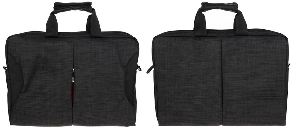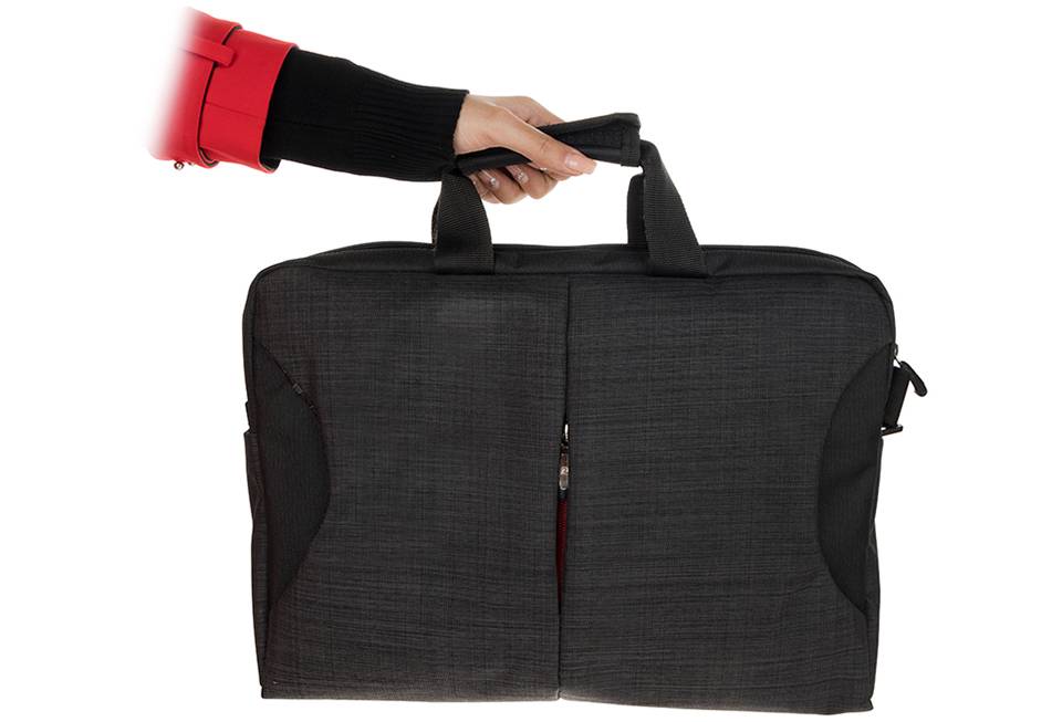 این کیف برای لپتاپهای تا 15.6 اینچی طراحی شده و ابعادی برابر با 28.5 × 6 × 39 سانتیمتر و وزن 475 گرمی دارد. لایه بیرونی این کیف از جنس برزنت است و مقاومت خوبی در برابر پارگی، ساییدگی و پاشش آب دارد. البته این پوشش ضدآب نیست و زیر بارانهای شدید و طولانی آب به داخل آن نفوذ میکند. در قسمت جلویی کیف یک زیپ به صورت عمودی وجود دارد که دسترسی به محفظه کوچکی در جلوی آن را میسر میکند. این زیپ به رنگ قرمز است و ترکیب ظاهری جذابی را در کنار رنگ ذغالی بدنه کیف به وجود آورده است. شبیه به همین جیب یک خط دوخت عمودی در پشت کیف هم به چشم میخورد که البته تنها جنبه زیبایی ظاهری داشته و به محفظه یا جیبی راه ندارد. رنگ قرمز تنها برای زیپ جلویی کیف مورد استفاده قرار نگرفته و محفظه نگه دارنده لپتاپ در داخل کیف هم به رنگ قرمز است. دستههای کیف کیفیت قابل قبولی دارند و میتوان آنها را با یک پوشش چسبی به یک دسته واحد تبدیل کرد که در دست گرفت کیف را آسانتر میکند. برای حمل روی دوش هم یک بند با قابلیت جدا شدن از کیف در کنار آن قرار گرفته است.