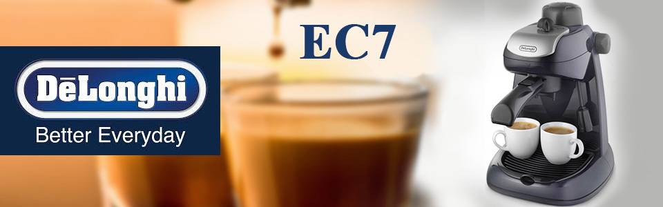 اسپرسوساز «دلونگی (Delonghi) مدل «EC7» دستگاهی با کیفیت است و بدنه آن از پلاستیک ساخته شده است. توان آن 800 وات است. این دستگاه امکان تهیه اسپرسو، کاپوچینو و کفشیررا دارد. در سمت چپ دستگاه یک دکمه برای روشن و خاموش کردن آن وجود دارد و دستگاه دارای دو نازل خروجی قهوه و سینی چکهگیر است؛ سینی چکهگیر قطرات قهوهای که از دستگاه میچکد را جمع میکند.