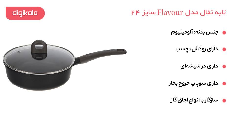 تابه‌ مدل «Flavour» با سایز 24 یکی از محصولات شرکت «تفال» است که مانند سایر محصولات این شرکت کیفیت ساخت بالا را به‌‎عنوان مشخصه‌ی اصلی به همراه دارد. بدنه‌ی تابه از جنس آلومینیوم ساخته شده است و به همین دلیل حرارت را به‌صورت یکسان به تمام قسمت‌ها منتقل می‌کند. کیفیت ساخت بسیار خوب و تکنولوژی‌های به‌کاررفته در این مدل سبب شده روی انواع اجاق‌ها از جمله برقی و گازی قابل‌استفاده باشد. Flavour سایز 24 آشپزی را برای یک خانواده‌ی چهار تا شش‌نفره میسر می‌کند. این تابه روی اکثر اجاق‌های برقی و گازی قابل‌استفاده خواهد بود. با گذاشتن Flavour روی اجاق و روشن‌کردن زیر آن، تکنولوژیInduction  به‌کاررفته در کف ظرف سبب می‌شود ماهیتابه به‌سرعت گرم شود. با داغ‌شدن ظرف به یک دسته‌ی عایق نیاز است تا بتوانید به‌راحتی تابه و موادغذایی را روی اجاق جابه‌جا کنید. تفال برای این ظرف دسته‌ای از جنس باکالیت انتخاب کرده است. باکالیت نوعی پلاستیک با ضریب انتقال حرارت بسیار پایین است. دسته‌‌ی عایق تابه در هنگام آشپزی به شما اجازه می‌دهد به‌راحتی و در ایمنی کامل آن ‌را در دست بگیرید و جابه‌جا کنید.