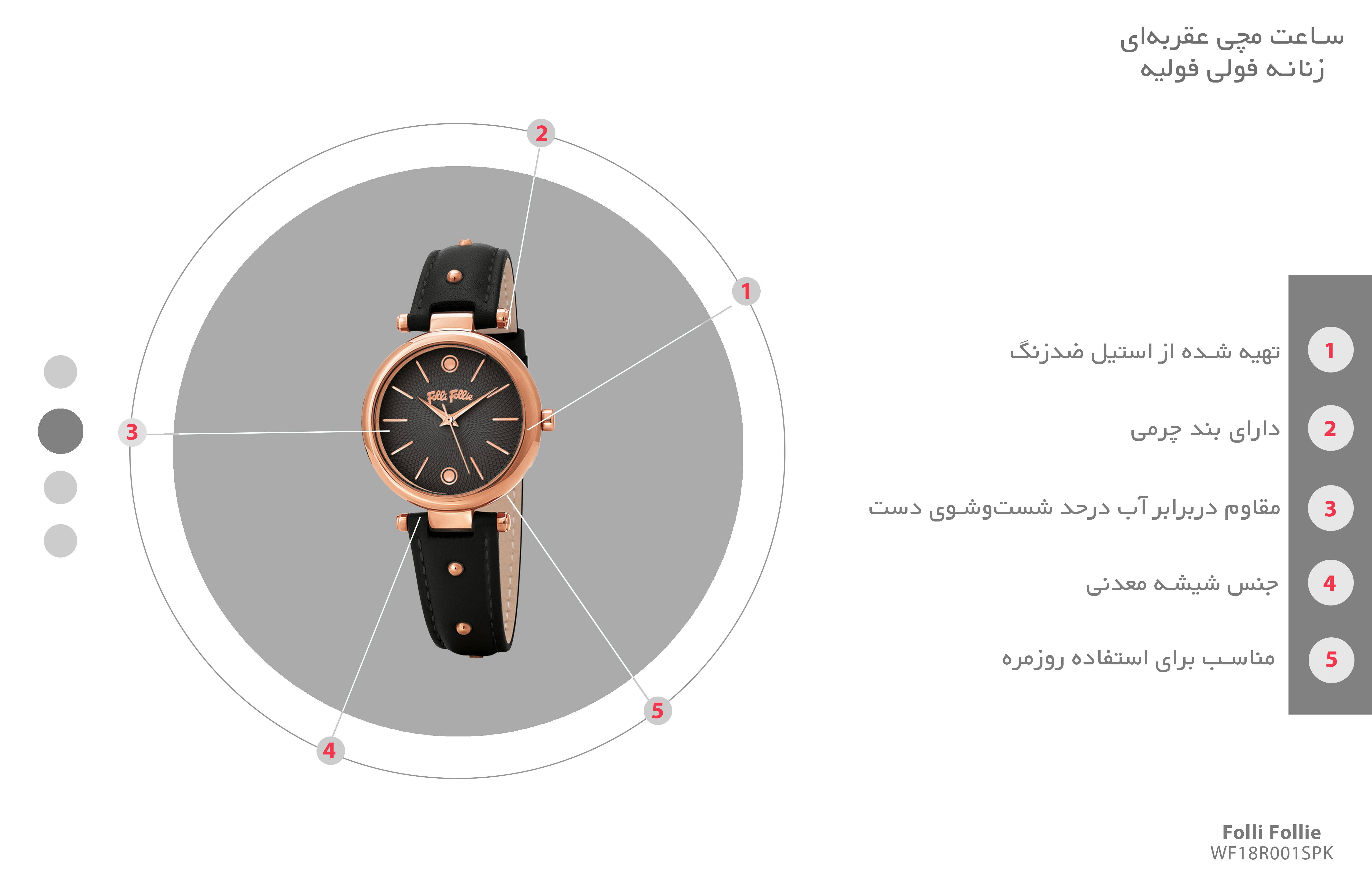 یکی از مهمترین نکاتی که در زندگی روزمره همه ما تأثیر زیادی دارد زمان است. داشتن ساعت مچی به شما کمک میکند که همواره زمان را بدانید و کارهای خود را طبق برنامه و با زمانبندی دقیق به انجام برسانید. ساعت مچی عقربهای زنانه فولی فولیه مدل WF18R001SPK-BL میتواند در این زمینه به شما کمک کند. این ساعت علاوهبر کارایی که دارد بسیار باکیفیت بوده و جلوه ظاهری زیبایی دارد. رنگ صفحه این ساعت مشکی بوده و با رنگ بدنه آن بهخوبی هماهنگ است. جنس بدنه آن استیل ضدزنگ بوده و رنگ بدنه آن رزگلد است و برای کسانی که حساسیت دارند مناسب است. از ویژگیهای مثبت این ساعت میتوان به مقاومت دربرابر آب اشاره کرد. جنس بند این ساعت چرم بوده و به رنگ مشکی است که زیبایی ساعت را افزایش داده است. ساعت مچی عقربهای زنانه فولی فولیه مدل WF18R001SPK-BL یک انتخاب مناسب برای بانوان خوشپوش و خوش سلیقه است.