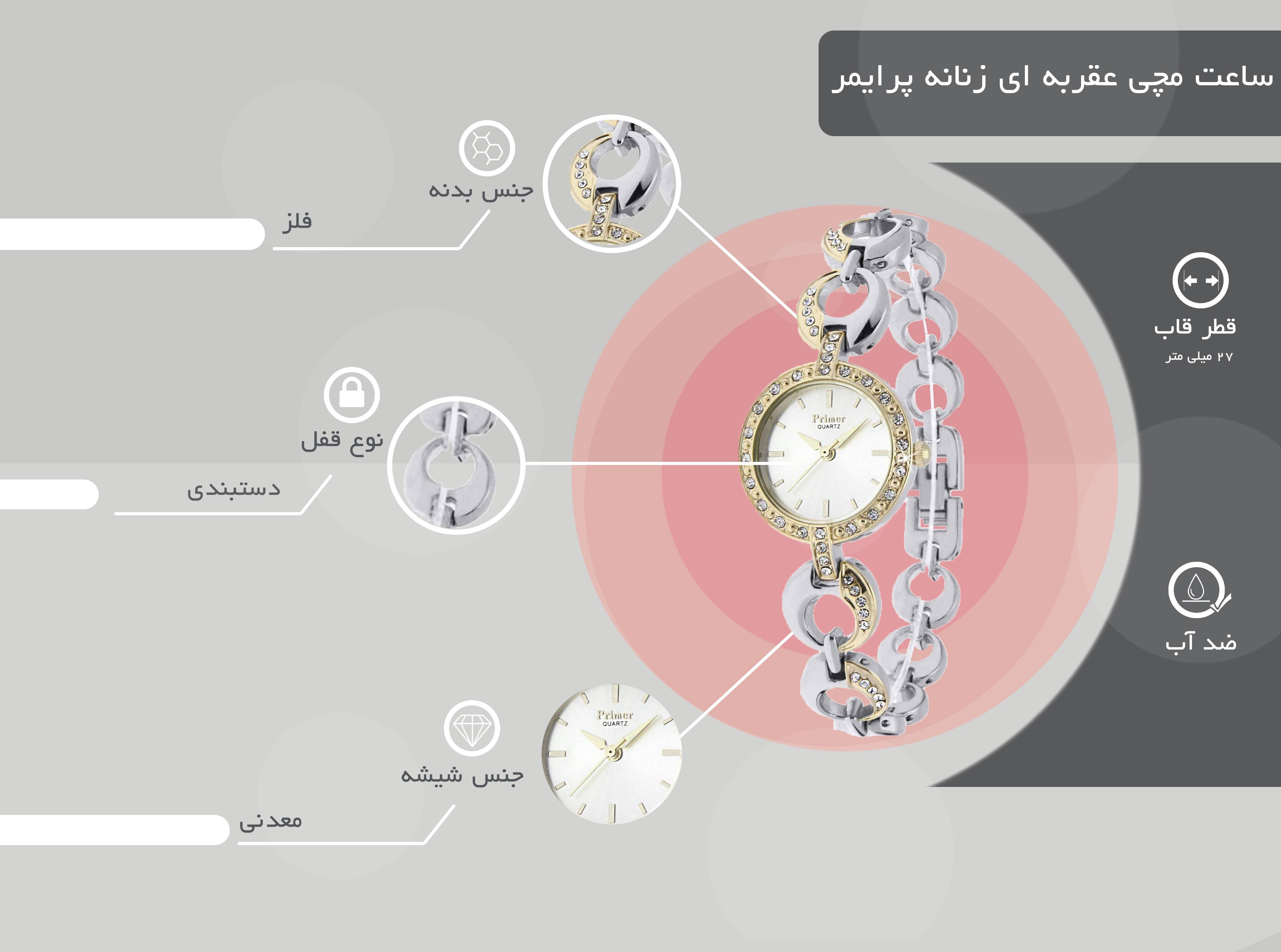 ساعت‌های دستبندی ظریف بخاطر اینکه هم یک دستبند زیبا و ظریف هستند و هم عملکرد ساعت را دارند، یکی از انتخاب‌های بسیار هوشندانه برای ساعت زنانه هستند .ساعت زنانه پرایمر با طراحی خاص صفحه اصلی و همچنین استفاده از ظرافت در طراحی بند از نظر ظاهری بسیار زیبا و خاص است. در طراحی این مدل از نگین‌های بسیار با دوام و مقاوم استفاده شده که زیبایی این ساعت را دو چندان کرده است. بند و بدنه فلزی این ساعت باعث دوام بسیار بالای آن و عمر زیاد آن نسبت به بندهای چرمی و ... می‌شود. جنس شیشه بکاربرده شده روی صفحه ساعت پرایمر معدنی است که در برابر ضربه و فشار تا حد خوبی مقاومت دارد. پرایمر برای این ساعت از موتور ژاپنی EPSON استفاده کرده است که از تکنولوژی کوارتز بهره می‌برد و جزو موتورهای باکیفیت موجود است. در مجموع اگر قصد خرید یک ساعت شیک و همه‌پسند درعین حال با دوام را دارید، این مدل انتخابی عالی برای موقعیت‌های مختلف و همچنین هدیه‌ای باارزش و ماندگار محسوب می‌شود.