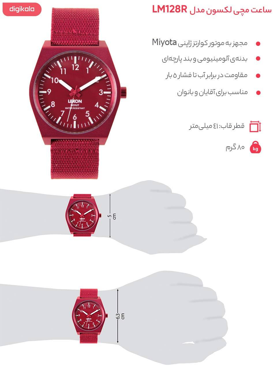 ساعت مچی عقربه‌ای «لکسون» مدل «Lexon LM128R» یکی از ساعت‌های شیک و جذاب مردانه زنانه است که یک مدل روزمره و فشن محسوب می‌شود. در طراحی این ساعت جذاب و دوست‌داشتنی از رنگ غالب قرمز استفاده شده که رنگ مهیج و جوان‌پسند به شمار می‌رود. قطر تقریبی ساعت 41 میلی‌متر است که ابعادی متوسط یا نسبتا بزرگ برای خانم‌ها به شمار می‌رود و با توجه به طراحی پرانتزی قاب، ساعت به خوبی روی مچ جلب توجه می‌کند. بدنه‌ی فلزی ساعت از جنس آلومینیوم است که در کنار استحکام و دوام بالا، از مزایایی نظیر وزن سبک و عدم ایجاد حساسیت بهره می‌برد. بند برزنتی ساعت هم در نوع خود شیک و راحت است که می‌توان گفت برای این سبک فشن و استفاده در موقعیت‌های روزمره انتخابی کاملا ایدئال به شمار می‌رود. صفحه‌ی ساعت هم به رنگ اصلی یعنی قرمز طراحی شده که بر روی آن نشانگرهایی خطی و عددی به رنگ سفید نقش بسته است. ساعت مچی لکسون مدل LM128R در سری «SCOUT» دسته‌بندی می‌شود که طراحی آن را دو طراح سوییسی و بلژیکی بر عهده داشته‌اند. مقاومت مطلوب در برابر آب دیگر مزیت کیفی ساعت محسوب می‌شود. با مقاومت در برابر آب تا فشار پنج بار یا پنجاه متر از نفوذ آب به بدنه در اغلب شرایط روزمره جلوگیری خواهد شد. در مجموع اگر می‌خواهید یک ساعت فشن، جذاب و شیک انتخاب کنید یا برای یک خانم جوان هدیه‌ای متفاوت و ماندگار تهیه کنید، این ساعت دوست‌داشتنی انتخابی عالی خواهد بود.