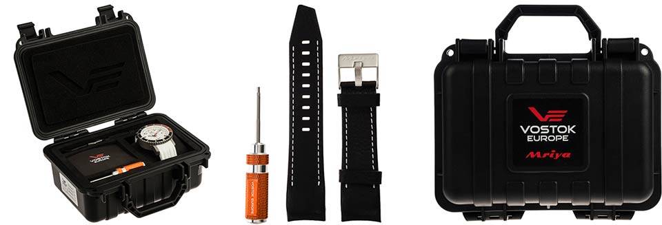 ساعت در یک باکس محکم (hard box) ضدآب و ضدضربه عرضه می‌شود که در داخل آن خود ساعت و متعلقات آن به شکلی زیبا و منظم چیده شده است. منظور از متعلقات ساعت، بند اضافه و همچنین یک آچار فلزی مخصوص از خود وستوک یوروپ برای تعویض بند است. بدین ترتیب انتخاب و عوض کردن بند کلاسیک برای موقعیت‌های روزمره و انتخاب بند سیلیکونی یا اسپرت برای استفاده کنار پوشش اسپرت و یا موقعیت‌های ورزشی، در کمترین زمان و به سادگی قابل انجام خواهد بود. بند کلاسیک از نوع چرمی به رنگ مشکی با دوخت سفید و بند اسپرت از نوع سیلیکونی با رنگ سفید طراحی شده است. با توجه به مقاومت بالا در برابر آب بند سیلیکونی گزینه‌ای کاملا مناسب برای موقعیت‌های ورزشی و روزمره محسوب می‌شود.