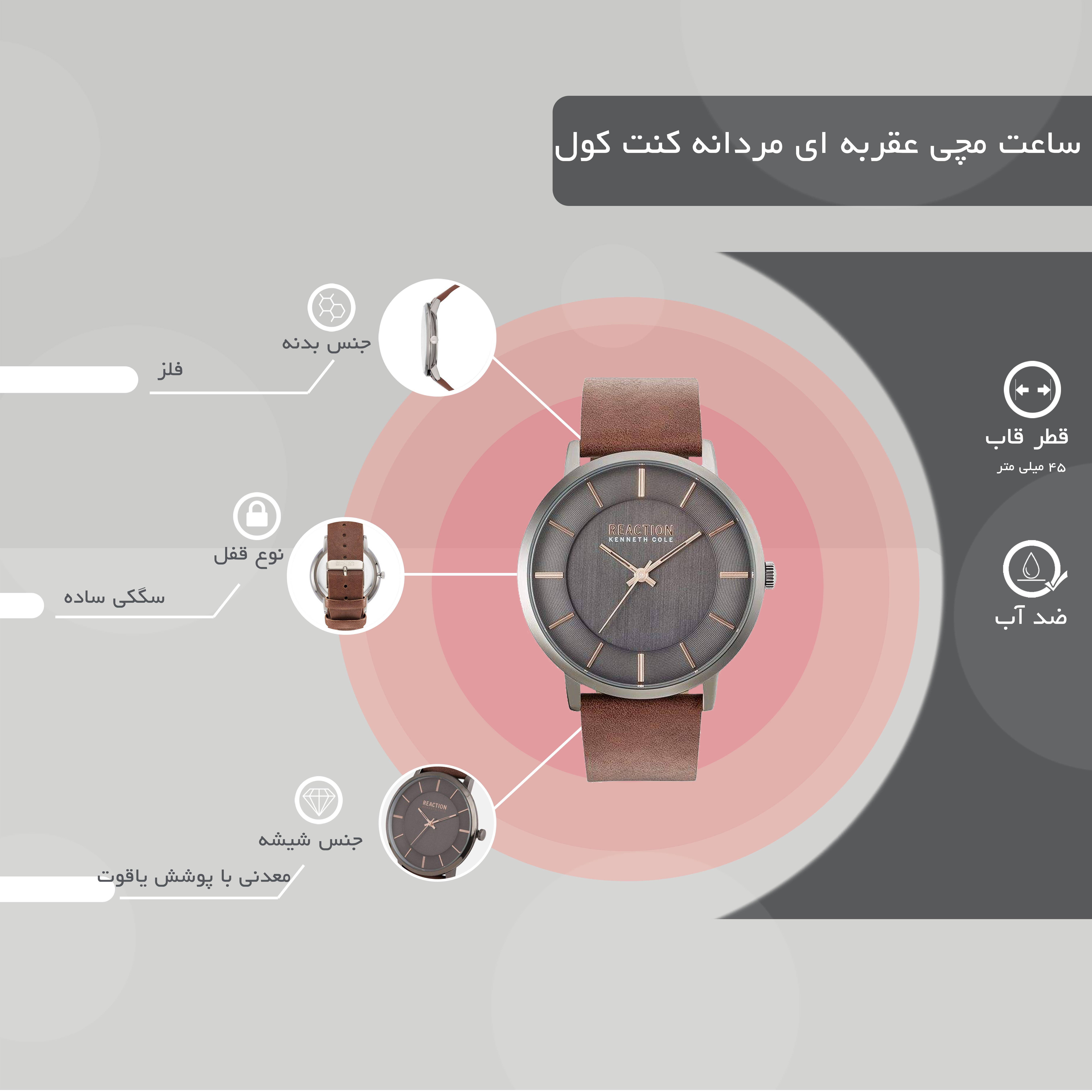 یکی از وسایلی که می‌تواند استایل فرد را جذاب‌تر و شیک‌تر کند، ساعت مچی است. ساعت‌های مچی در شکل‌ها و اندازه‌ها و رنگ‌های متفاوتی عرضه می‌شوند و هرکدام دارای ویژگی‌های خاص خود هستند. اگر به‌دنبال یک ساعت شیک، زیبا و البته باکیفیت و اصیل ، با قیمت مناسب هستید، برند آمریکایی «کنت کول» یکی از خانواده های میان رده ی خود یعنی «ری اکشن» (REACTION) را پیشنهاد می‌کند. همان‌طور که در تصاویر مشاهده می‌شود، صفحه‌ی گرد این ساعت خاکستری رنگ بوده و با عقربه های رزگلد تزیین شده است. در صفحه‌ی ساعت به جای اعداد معمولی یا رومی، از خطوطی باریک برای نشان دادن زمان استفاده شده است. این محصول ساده و در عین حال کلاسیک و زیبا، در اثر مرطوب شدن دچار مشکل نخواهد شد و تا فشار۳۰ متر در برابر نفوذ آب مقاومت می‌کند. در مجموع اگر قصد خرید یک ساعت ، با کیفیت آمریکایی، و با موتور ژاپنی با کیفیت و به معنی واقعی کلمه کلاسیک و ساده و جذاب را دارید، این ساعت مردانه یکی از بهترین گزینه ها به شمار می‌رود که با زیبایی، کیفیت، ماندگاری و دقت بالای موتور ژاپنی خود توجه هر مرد شیک‌پوش و سخت پسند را به خود جلب می‌سازد. همچنین به عنوان یک هدیه‌ی باارزش، بی‌نظیر و به‌یادماندنی و همه پسند ، با قیمت مطلوب ، می‌تواند از بهترین گزینه ها باشد.