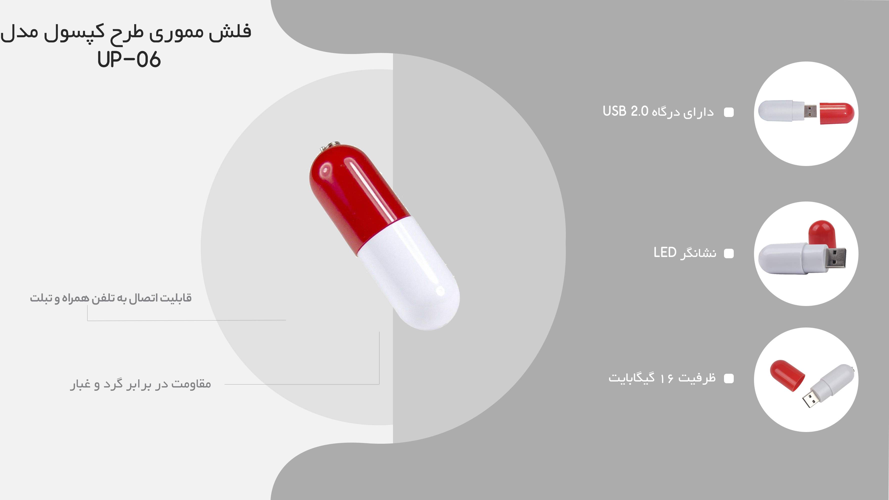 فلش مموریها تقریبا جز جدایی ناپذیر زندگی روزمره ما تبدیل شدهاند. این ابزار کوچک دوست داشتنی چنان کاربردی شده است که تقریبا هر کدام از ما چندین فلش مموری داریم. جدا از بحث سرعت فلش مموریها، نوع بدنه فلش هم در فاکتورهای خرید بسیار تاثیرگذار است. فلش مموری کپسول مدل UP-06 به شکل یه کپسول طراحی شده که علاوه بر یک دستگاه ذخیره سازی اطلاعات با سرعت بسیار بالا، میتواند به عنوان یک جاکلیدی کوچک همیشه و همه جا به دنبال شما باشد. همچنین به علت طراحی زیبا و کیفیت بالا، هدیهای جذاب و قابل توجه برای عزیزان، دوستان و حتی مشتریان شما باشد. این محصول بسیار جمع و جور و سبک وزن بوده و برای حفظ تمام اسناد، فیلمها، موسیقی و عکسهای شما ایدئال است. مصرف انرژی کم، ذخیره سازی بسیار پایدار، کاربری آسان برای خواندن ونوشتن اطلاعات با سرعت بالا، بدون نیاز به درایور از دیگر ویژگیهای این محصول است. بدنه این فلش مموری از پلاستیک فشرده و با کیفیت بالا ساخته شده و با توجه به ظرفیت نسبتا بالا میتواند وسیلهای بسیار زیبا، کاربردی و جذاب باشد. این فلش مموری در بسته بندی فانتزی و نفیس عرضه میگردد.
