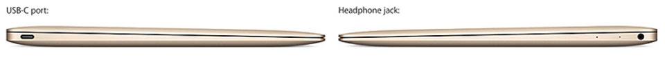 یکی از فناوری‌های جدیدی که اپل در ساخت مک‌بوک 12 اینچی استفاده کرده، به کار بردن پورت USB-C به جای تمامی پورت‌های دیگر است. در این دستگاه شما هیچ‌کدام از پورت‌های USB 2.0، USB3.0، HDMI یا VGA را مشاهده نمی‌کنید. حتی اتصال شارژ هم توسط پورت USB-C انجام می‌شود. به لطف دوطرفه بودن و خاصیت آهنربایی فیش شارژر، به راحتی می‌توان آن را به دستگاه متصل کرد. اتصال فیزیکی دیگر دستگاه جک 3.5 میلی‌متری صدا است که در لبه راست مشاهده می‌شود. پورت USB-C یکی از جدیدترین فناوری‌هایی است که از استاندارد USB3.1 نسل اول الهام گرفته‌شده. سرعت انتقال اطلاعات با پورت USB-C چیزی حدود 10 گیگابیت بر ثانیه است، اما با توجه به قدرت پردازنده‌ی مرکزی سری M شرکت اینتل که در این دستگاه استفاده شده، این سرعت نمی‌تواند چیزی بیش از 5 گیگابیت بر ثانیه باشد. با این وجود، پورت USB-C انقلابی در عرصه انتقال اطلاعات و طراحی مینیمالیستی در مک‌بوک 12 اینچی است که جایگزین تمامی پورت‌های فیزیکی در این لپ‌تاپ شده. برای اتصال سایر پورت‌ها به USB-C شما باید از تبدیل آن استفاده کنید.