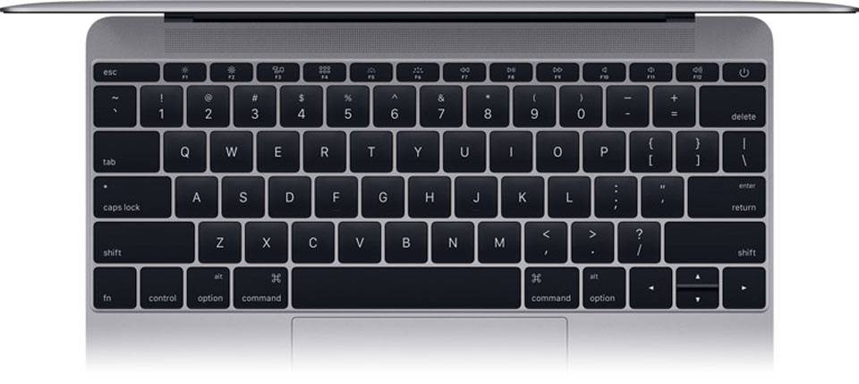 معمولا قسمت کیبورد لپ‌تاپ‌ها فضای زیادی را اشغال می‌کند و به جای آن می‌توان از دیگر قطعات حیاتی استفاده کرد. در مورد مک‌بوک 12 اینچی، اپل کلیدهای کیبورد را به شکل پروانه‌ای باز طراحی کرد و توانست با این کار حدود 40% فضای بیشتری نسبت به کلیدهای کیبوردهای قدیمی‌تر ایجاد کند. البته قرار است این طراحی جدید باعث شود تا عمل تایپ راحت‌تر و با احتمال خطای کمتر امکان پذیر باشد. کیبورد این دستگاه از کلیدهای مربعی شکلی با ابعاد 17×17 میلی‌متری تشکیل شده است. کلیدهای نسبتا بزرگ کیبورد  باعث می‌شوند تا تایپ کردن به عملی لذت بخش تبدیل شود. حاشیه دو طرف کیبورد تقریبا حذف شده‌اند و فضای اضافی‌ای مشاهده نمی‌شود. بعد از مدت کوتاهی به تایپ با این دستگاه عادت خواهید کرد و متوجه می‌شوید که سرعت شما افزایش یافته است. کلیدها کاملا نرم و حساس هستند و با کمترین فشار عمل می‌کنند. دیگر نکته قابل توجه درباره کیبورد، نور پس‌زمینه آن است. در این دستگاه برای هر کلید یک چراغ LED جداگانه تعبیه شده است که در تاریکی و نور شب، باعث می‌شود حروف و اطراف کلیدها کاملا واضح باشند.