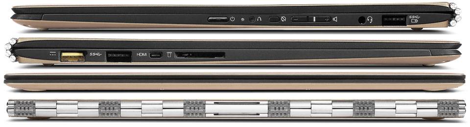علاوه بر این، شکل طراحی این لولا باعث شده است که در حالت بسته بودن لپتاپ یا در حالت تبلت، صفحهی نمایش کاملا روی بدنه قرار گیرد. به همین دلیل Yoga 3 Pro توانسته است لقب یکی از باریکترین لپتاپهای هیبریدی حال حاضر را به خود اختصاص دهد. این دستگاه تنها 12.7 میلیمتر ضخامت دارد که حدود 3.5 میلیمتر از Yoga 2 Pro باریکتر و کمی از یک خودکار معمولی ضخیمتر است. به همین دلیل به راحتی میتوان این لپتاپ را در کیفها یا کاورهای کوچک و باریک قرار داد یا حتی در دست گرفت و جابجا کرد. علاوه بر بدنه باریک، سبک بودن هم از دیگر ویژگیهای قابل توجه Yoga 3 Pro است. این دستگاه تنها یک کیلو و 180 گرم وزن دارد که از بسیاری اولترابوکهای 13 اینچی مانند MacBook Air اپل یا Zenbook UX301 ایسوس هم باریکتر است.