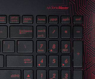 کیبورد این لپتاپ از نوع جزیرهای با کلیدهای کامل (شامل کلیدهای ماشین حساب در سمت راست) است. کلیدهای حروف ابعاد 1.5 در 1.5 میلیمتر و کلیدهای عدد ماشین حساب ابعاد 1 در 1.5 میلیمتر داشته و باقی کلیدها هم بسته به نوع کاربری ابعاد متفاوتی دارد. ابعاد کلیدها و چیدمان آنها دقیقا همان چیزی است که در لپتاپهای مخصوص بازی ایسوس مانند G551 هم وجود دارد. به همین دلیل بازی کردن و تایپ کردن با این کیبورد راحت است. البته جنس کلیدها و نحوه و میزان فشار آنها حس کار با کیبورد یک لپتاپ ردهبالا را به کاربر منتقل نمیکند، اما در مجموع کارایی قابلقبولی دارد. برای نزدیکتر شدن هرچه بیشتر به شکل و شمایل یک لپتاپ مخصوص بازی، ایسوس برای نوشتن حروف و اعداد روی کلیدها از رنگ قرمز استفاده کرده است که در نگاه اول جالب است. اما به دلیل نداشتن نور پسزمینه، که یکی از نقاط ضعف این کیبورد محسوب میشود، زمانی که نور زیادی به کیبورد تابیده شود، دیدن و تشخیص دادن حروف روی کلیدها کمی مشکل میشود و اگر بخواهید زمان طولانی مدتی با این کیبورد تایپ کرده و مرتب به کلیدها نگاه کنید، این رنگ قرمز تا حدودی آزاردهنده خواهد بود.