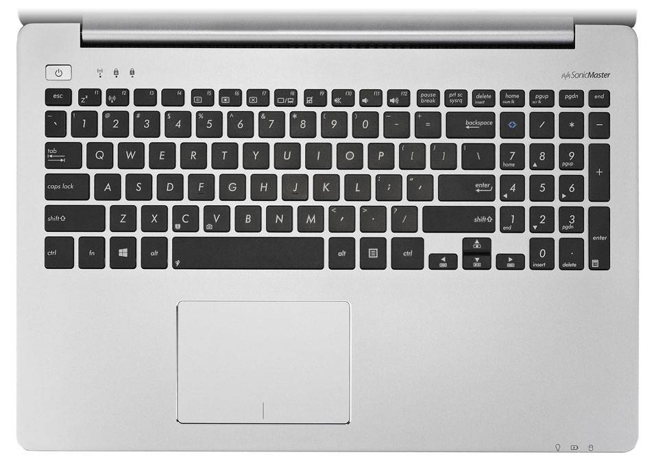 کیبورد جزیرهای با کلیدهای مشکی و بزرگ، در میان فضایی نقرهای رنگ و آلومینیومی، خودنمایی میکند. کلیدها به خوبی طراحی شدهاند و به لطف ابعاد بزرگ، فضای کافی و آستانه و عمق مناسب، میتوان با سرعت زیاد و درصد خطای کم، با آنها تایپ کرد. تاچ پد هم به تکنولوژی جدید Smart Gesture مجهز شده که طبق ادعای ایسوس، باعث افزایش دقت و حساسیت تاچ پد میشود. تاچ پد با حسگر حساس و قابلیت فرمانبری چند لمسی به کاربر این امکان را میدهد تا بتواند راحتتر و بدون استفاده از ماوس، با نصب درایور و نرمافزار مربوط به تاچ پد در ویندوز 8 و بالاتر، از فرمانهای لمسی خاص آن، مثل اسکرول یا بزرگنمایی تصاویر دوانگشتی و سوئیچ بین آخرین برنامهها و دیگر فرمانهای معمول بهرهمند شود.