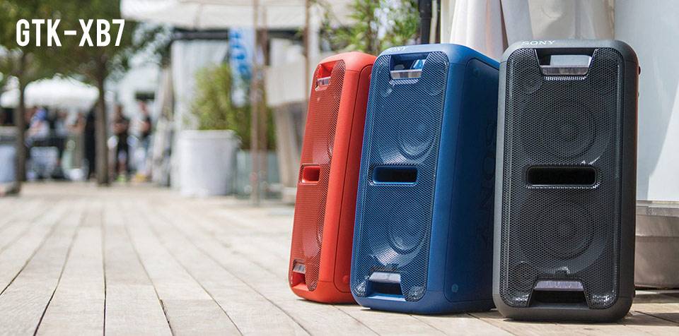 یک پخشکنندهی پرقدرت قابلحمل. مدل «GTK-XB7» از محصولات بسیار خوشساخت «سونی» (Sony) است. صدایی که از این اسپیکر پخش میشود، بهلطف قطر درایو 1.97اینچیاش، از قدرت و کیفیتی پذیرفتنی برخوردار است. این پخشکننده با پشتیبانی از بلوتوث و NFC امکان انتقال موسیقی را به صورت بیسیم فراهم میآورد؛ یعنی تمام حضار میتوانند به میل خود فایلهای صوتی موجود در تلفن همراهشان را به این اسپیکر پرقدرت منتقل کنند. پخشکنندههای موسیقی قابلحمل مانند MP3 Player هایی که مجهز به بلوتوث داخلی هستند، با این پخشکننده سازگارند. درصورتیکه هیچکدام از دستگاههای دیجیتالیتان مجهز به بلوتوث نباشند، میتوانید با استفاده از پورت USB تعبیهشده در پشت بدنه، فلشمموری خود را متصل کرده و از فایلهای صوتی خود استفاده کنید. همچنین برای این مدل ورودی RCA تعبیه شده است تا بتوانید بهواسطهی یک کابل نیز موسیقی را منتقل کنید. درصورتیکه دو یا چند عدد از این اسپیکر تهیه کنید، میتوانید بهواسطهی همین ورودی از قابلیت Party Chain استفاده کرده و اسپیکرها را با یکدیگر هماهنگ کنید. منبعتغذیهی GTK-XB7 از طریق کابل AC فراهم میشود و فاقد باتری است. در قسمت بالای بدنهی آن دکمهی Power و کنترل سطح صدا تعبیه شده است. همچنین سه عدد نشانگر LED برای نشاندادن اتصال بلوتوث، USB یا کابل صدا طراحی شده است. با فشار دکمهی Extra Bass، صدای تولیدشده از اسپیکرها، بیس بیشتری خواهد داشت و متناسب با نوع موسیقی درحالپخش، میتواند بسیار هیجانانگیز باشد. این اسپیکر در سه رنگ مشکی، قرمز و بنفش طراحی شده است تا کاربران قادر به انتخاب باشند. یکی دیگر از امکانات بسیار جذاب این اسپیکر، پشتیبانی از اپلیکیشن SongPal است. با دانلود و نصب آن روی موبایل هوشمند خود، میتوانید رقصنور و افکتهای صوتی متفاوتی را انتخاب کرده و مهمانی خود را هیجانانگیزتر کنید. درمجموع برای علاقهمندان به موسیقی این سیستمصوتی گزینهی بسیار خوبی محسوب میشود.