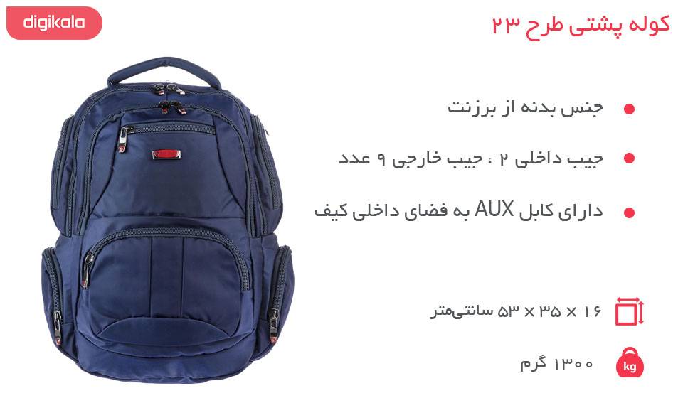 کولهپشتی طرح 23 با ظاهری زیبا و اسپرت و چندین جیب خارجی و فضای بسیار انتخابی مناسب برای افرادی است که نیاز به یک کولهپشتی برای مصارف روزانه و حتی دانشگاه و مدرسه دارند. دو رنگ مشکی و سرمهای این کوله قابل ست کردن با هر رنگی است. یکی از ویژگیهای هیجانانگیز این کولهپشتی وجود یک درگاه 3.5 میلیمتری برای هدفون است. شما میتوانید باوجود درگاه هدفون بهراحتی در هرجایی که هستید به موزیک مورد دلخواه خود گوش دهید. ویژگیهای مطلوب این کولهپشتی وجود جیبهای متعدد خارجی و پد داخلی در بندها برای جلوگیری از وارد شدن فشار به شانه و کمر است. علاوه بر این مزیتها وجود حالت ارگونومیک در قسمتپشتی مانع خستگی کمر شما و حمل آسانتر وسایلتان خواهد بود. این کولهپشتی دارای محل نگهداری لپتاپ بوده و از مقاومت قابلی قبولی در برابر ضربه دارد. اگر نیاز به یک کولهی باکیفیت و بادوام دارید کولهپشتی طرح 23 انتخاب مناسبی است.