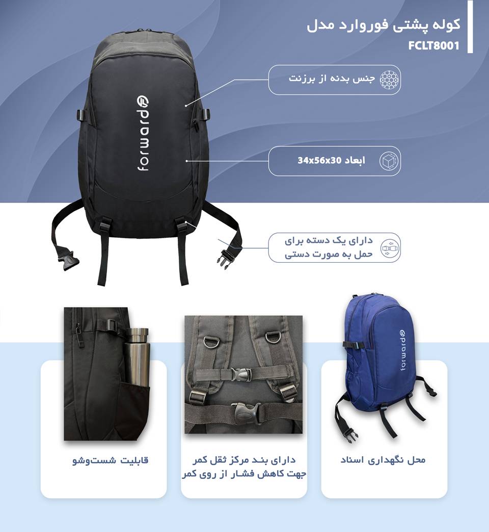 این محصول زیبا از  برزنت تهیه شده و همین متریال باعث شده تا مقاومت خوبی نسبت به سایر متریال‌ها برخورد باشد.  ابعاد متوسط این کالا باعث شده تا حمل آن برای سنین مختلف آسان‌تر باشد و ابعاد این کالا به ترتیب 30، 56 در 34 سانتی‌متر است که با توجه به این ابعاد حجم داخلی آن 55 لیتر می‌رسد. وزن کوله 890 گرم است در صورتی که وسایل خود را درون آن قرار دهید بیش از اندازه سنگین نمی‌شود تا در زمان راه رفتن جلوی حرکت ما را بگیرد. وجود 2 دسته یکی از در قسمت بالا و یکی در قسمت پشت کیف باعث شده تا به صورت دستی و کوله پشتی بتوانیم آن را حمل کنیم. بندهای پشتی این کیف به وسله سگک قابل تنظیم هستند. استفاده از بندی در مرکز ثقل کمر و ثقل شانه کمک کرده تا فشار از روی کمر و شانه در قسمت‌های دیگر پخش شده و در نتیجه حمل آن راحت‌تر باشد. در قسمت جلوی کوله پشتی فوروارد مدل FCLT8001 یک جیب وجود دارد که به صورت زیپی بسته می‌شود و در صورتی که وسایل مختلفی داشته باشیم می‌توانیم به کمک این جیب‌، برای آن‌ها فضایی در نظر بگیریم. علاوه بر این دو جیب در قسمت طرفین هم جیب‌های دیگری برای قرار دادن بطری آن تعبیه شده است. داشتن رنگ‌بندی متنوع و زیاد این محصول دست ما را در انتخاب باز گذاشته است و از دیگر مزیت‌های این کالا این است که به راحتی می‌توان از آن فراغ از هر جنسیت و سنی استفاده برای کاربرد‌های گوناگون مثل کوله پشتی روزمره استفاده کرد.