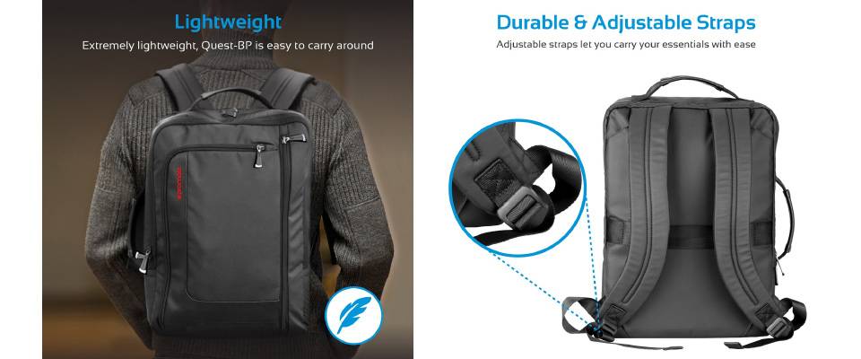 کوله پشتی «پرومیت» مدل «Quest-BP» برای لپتاپهای 15.6 اینچی طراحی شده و 900 گرم وزن دارد. این کوله پشتی با استفاده از پلیاورتان ساخته شده و 440 میلیمتر طول دارد. عرض آن هم 340 میلیمتر و ضخامت کوله پشتی 100 میلیمتر است. در این کوله پشتی یک محفظهی اصلی وجود دارد که به وسیلهی زیپ باز و بسته میشود. در این محفظه فضای کافی برای نگهداری از یک لپتاپ 15.6 اینچی، یک تبلت یا آیپد و لوازم جانبی از قبیل شارژر و ماوس وجود دارد. جلوی این کیف نیز جیب بزرگ زیپی طراحی شده که داخل آن تعدادی جیب کوچکتر وجود دارد. شما با استفاده از این جیبها میتوانید لوازمی مانند کیف پول، کابل، هندزفری، هارد اکسترنال، دفترچه یادداشت و غیره را همراه با خود داشته باشید. در این کولهپشتی یک جیب کوچک هم قرار دارد تا از آن برای نگهداری و حمل گوشی موبایل بهره ببرید. یکی از ویژگیهای این کولهپشتی ضدآب بودن لایهی خارجی آن است. این پوشش باعث میشود که رطوبت به داخل کوله نفوذ نکند و در روزهای بارانی آسیبی به وسایل داخل آن وارد نشود. گفتنی است پرومیت برای این محصول دو دسته در نظر گرفته است. در واقع این محصول دوکاره بوده و از آن میتوان به عنوان کیف دستی نیز بهره برد.